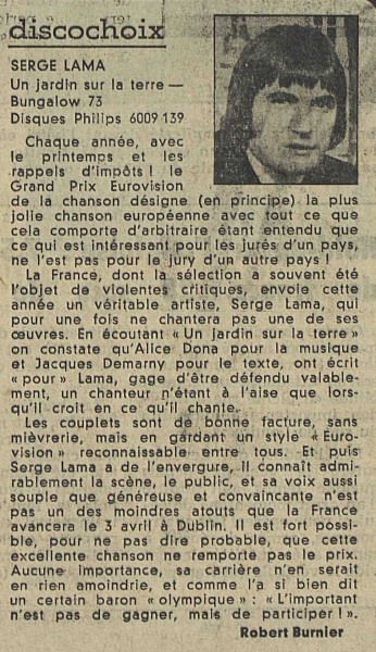 Seule chanson dont Serge Lama n'a pas écrit les paroles car pour participer à l'eurovision le règlement de l'époque interdisait d'en être l'auteur.