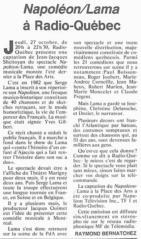27 Octobre 1988: Diffusion de Napoléon à la télé Quebequoise