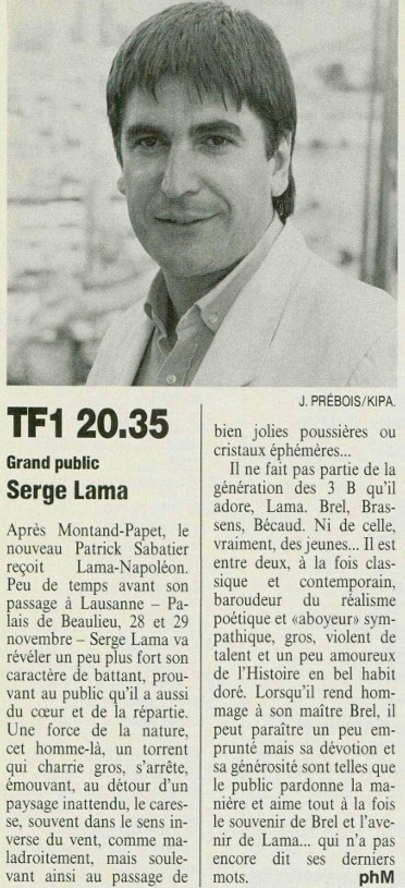 Le 26 septembre 1986, Serge Lama est l'invité de Patrick SABATIER dans son émission GRAND PUBLIC sur TF1.